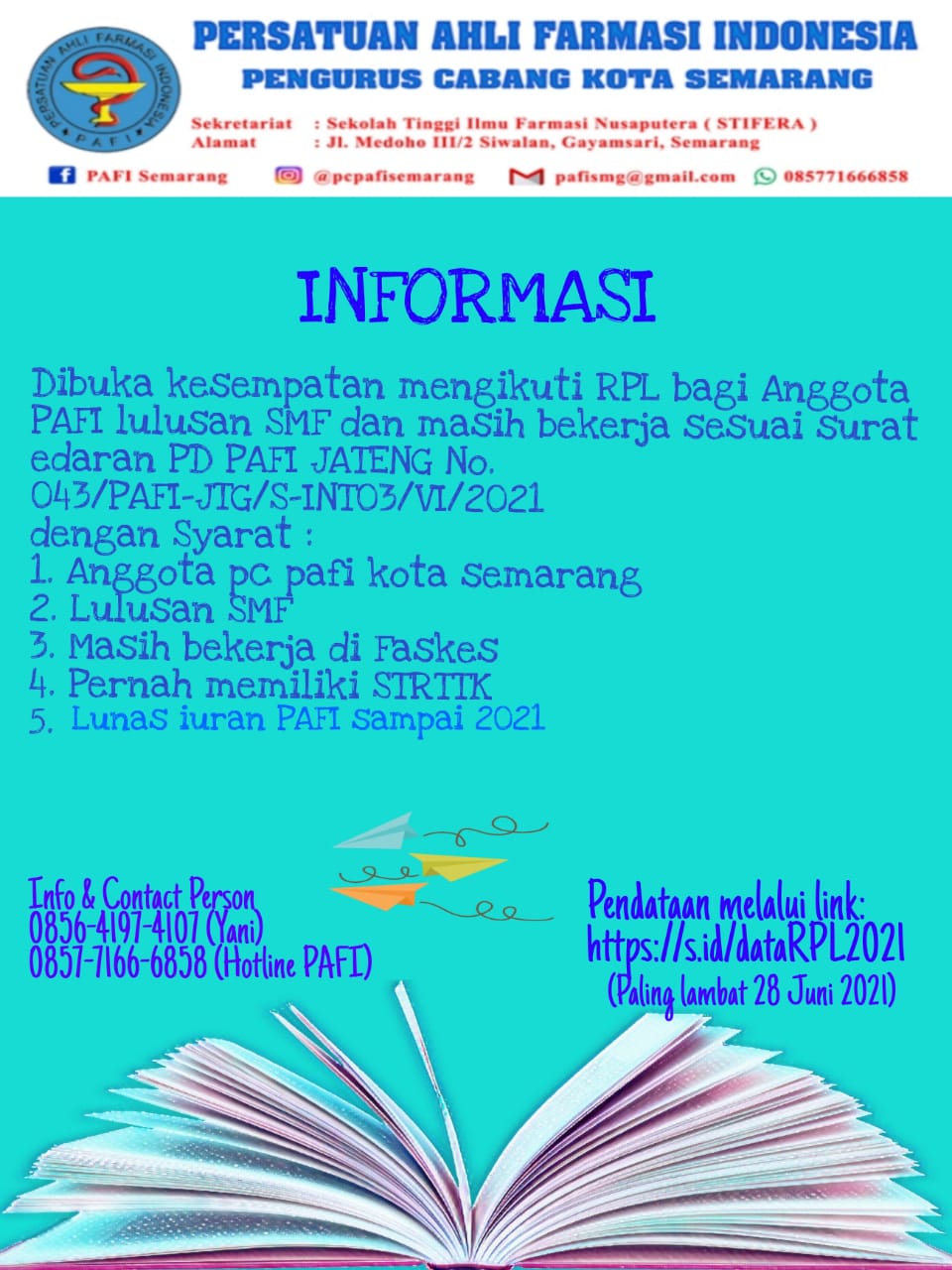 Menindaklanjuti surat edaran dari PD PAFI Jawa Tengah tentang RPL, dimohon bagi anggota PC PAFI Kota Semarang yang masih lulusan SMF
